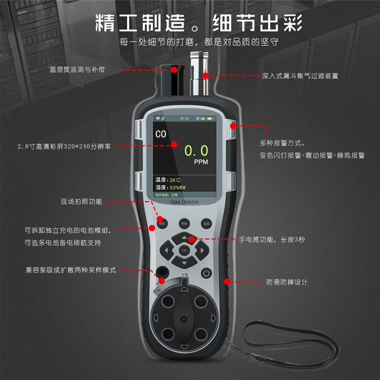 新一代手持式氣體檢測儀(泵吸+擴散)系列,是用于現場檢測氣體泄漏和其它特殊用途的一款高端手持可移動式氣體檢測儀。該氣體檢測儀兼容泵吸或擴散采樣方式對氣體濃度進行檢測,同時還具有報警、現場圖像拍照或攝像、溫濕度檢測、無線數據傳輸、現場多模式顯示、連接拓安服務器數據存儲分析等多種強大功能。是集高科技、物聯化支持、人性化操作理念、多種技術資源于一身的全新物聯網型手持氣體檢測儀。